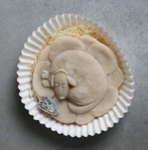 Um den schlecht gelaunten Frührentner aus Marzipan zu beruhigen, wurde er auf weißes Papier gelegt, fotografiert, farbig bemalt und darf sich nun in einer eigenen Konfekt-Schachtel ausruhen. Wie man sieht, kann er sich immerhin einen seidenen Morgenrock leisten.