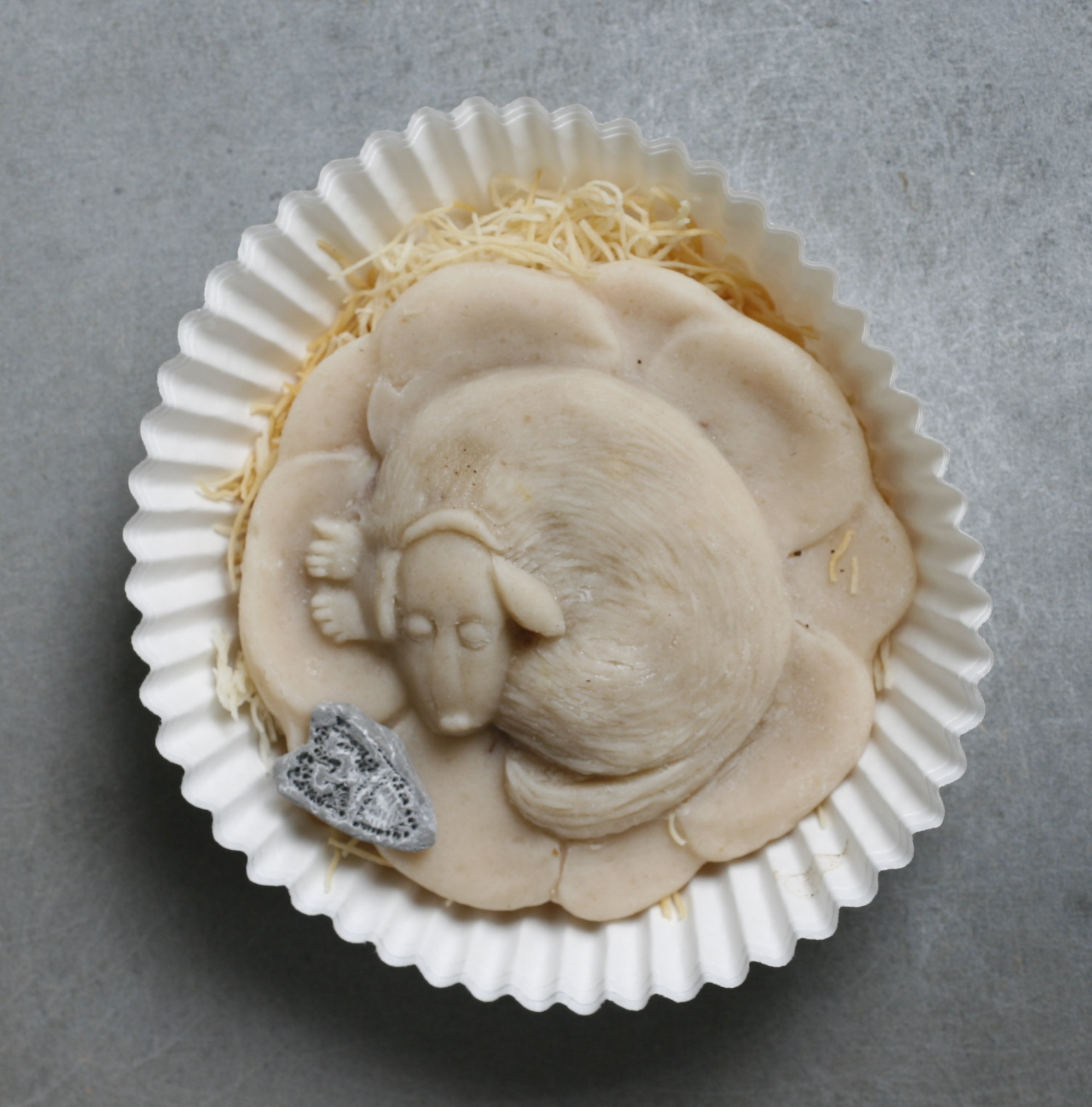Das Foto huldigt einem Hund, welcher trotz lahmer Hüften noch tapfer und zielsicher mittut, wenn die versammelte Familie mit einem Luftballon Ball spielt. Hier darf er auf Rosenblättern ausruhen. Gefüllt ist er heute mit Pistazien, Engelshaar und Schokolade. An hohen Festtagen wird er vergoldet.